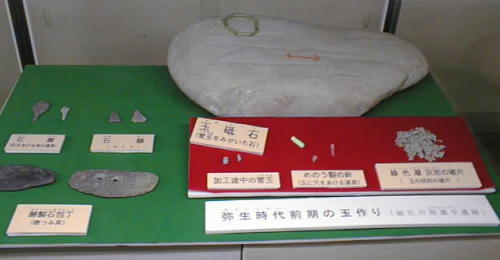 県下でも珍しい弥生時代前期の竪穴式住居跡も発見され、その一軒から、碧玉製の菅玉の未製品やメノウ製の孔開け用の道具、玉