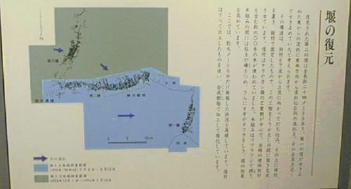 当時の土木技術の高いレベルを窺わせる。堰の上流側には水が流れないように、オギを敷いたり粘土を詰めたりした跡も見