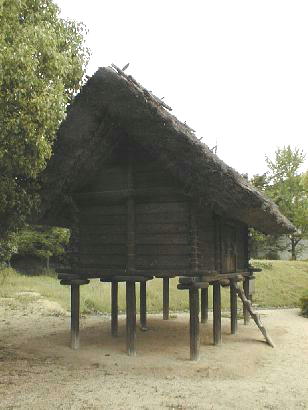 復元された高床式建物は、古照遺跡出土の部材を組み合わせた結果から類推したもの。