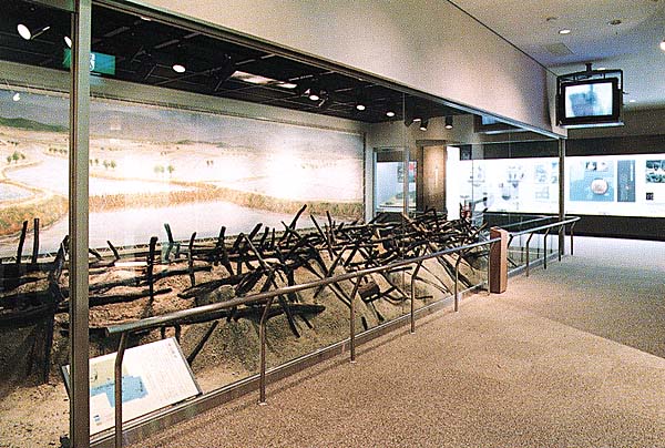 この遺跡の保存には、出土した木材にPEG(ポリエチレングリコール)液保存処理法を施すことによって、木製品の半永