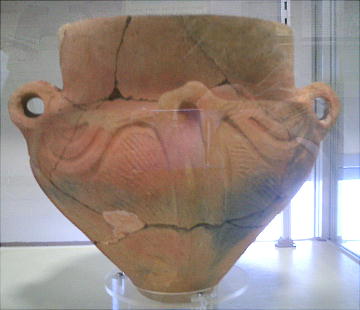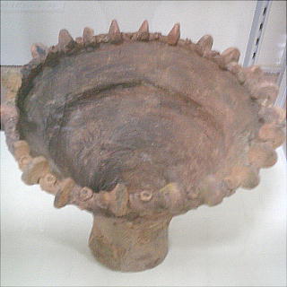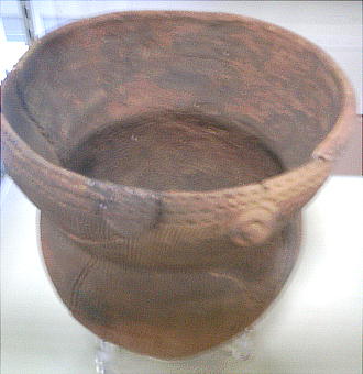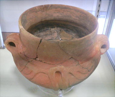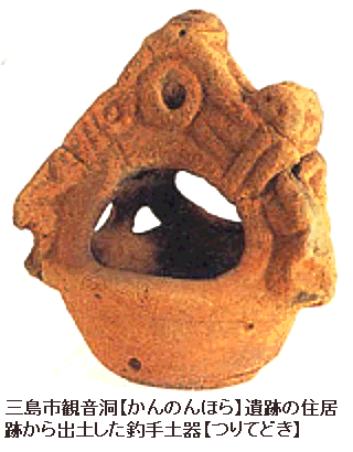 写真は、観音洞遺跡の住居跡から完全な形で出土したもので、高さ19cm。鉢の縁のところに橋状の釣手が