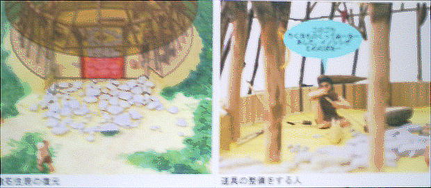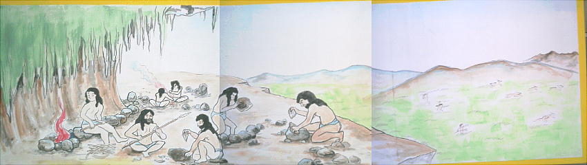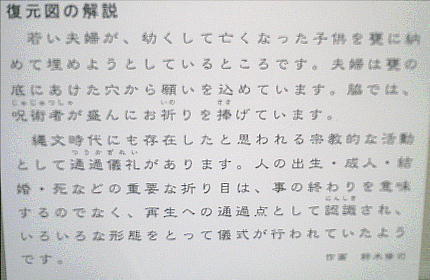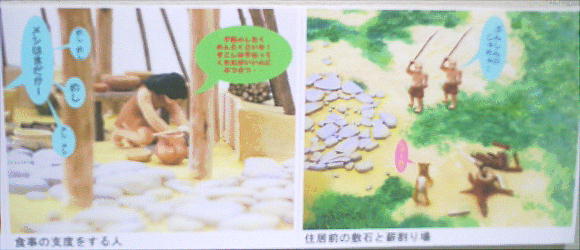 上の絵は、千枚原遺跡から発見された住居跡を元にして、当時の暮らしを復元して描いたもの。当時の住居は、