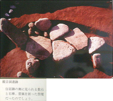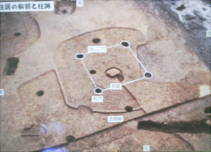 この住居跡は、長さ6mほどの大きさで、川原石で作られた囲炉裏と6本の柱穴があった。入り口方向の柱穴の