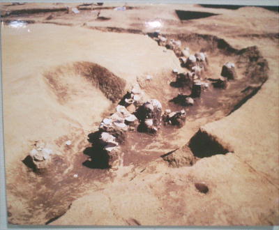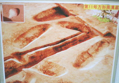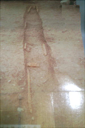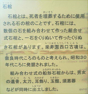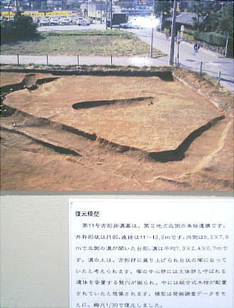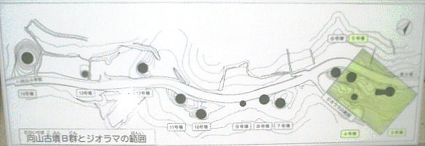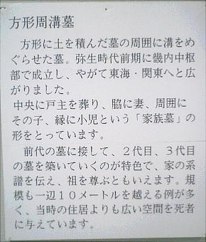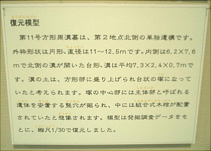 眺望のいい場所の尾根を削って、それに土を盛って作られていた。3mx6m程の棺の跡が見つかり、木棺