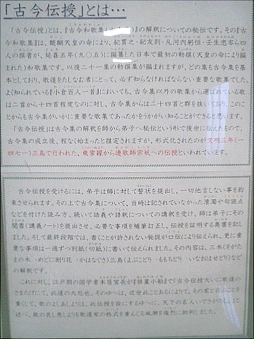 「古今伝授」とは「古今和歌集」の解読・解釈を伝えたもので、平安時代末、藤原基俊から俊成・定家…と代々