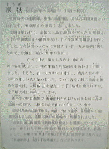 に松尾芭蕉は宗祇を敬慕し、宗祇の句に呼応した俳句を多く残している。1502年、江戸へ下り、次いで駿河へ向か