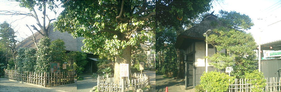 屋敷内に併設されている「区立郷土資料館」の入口(上右)。樹齢七十余年の大木・くすのきが聳える。