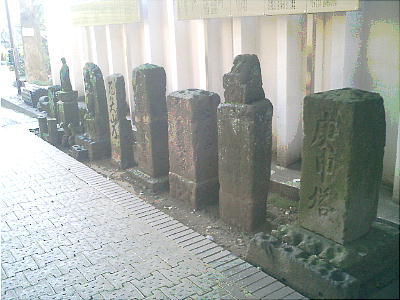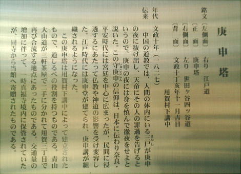 庚申尊天の石柱(上、右端)とその解説(下左)。私の田舎(福岡県)にも大阪にもあるし、江戸にも庚申信仰がある!