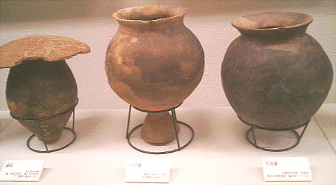 展示室は二階になっており、その階段の前に縄文土器が2つ並んでいる。