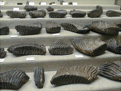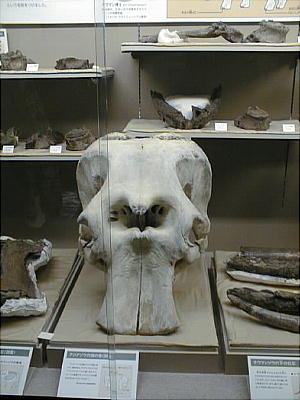 もある牙の化石も見つかっていて、アジアゾウなどと比べて非常に立派な牙を持っていた。上の写真のように、ひたいの部
