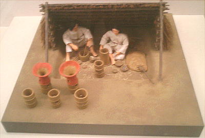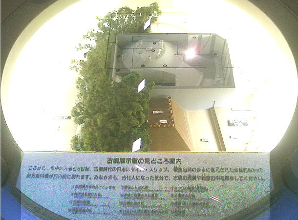 資料館に入ると、正面にデーンと巨大な古墳の復元ジオラマ(?)がある。古墳自体はどこか特定の古墳ではなく、一般的