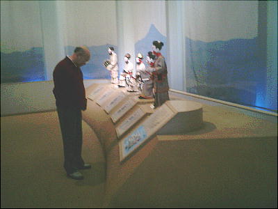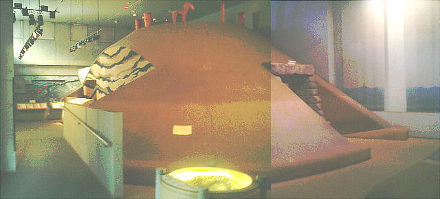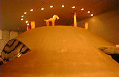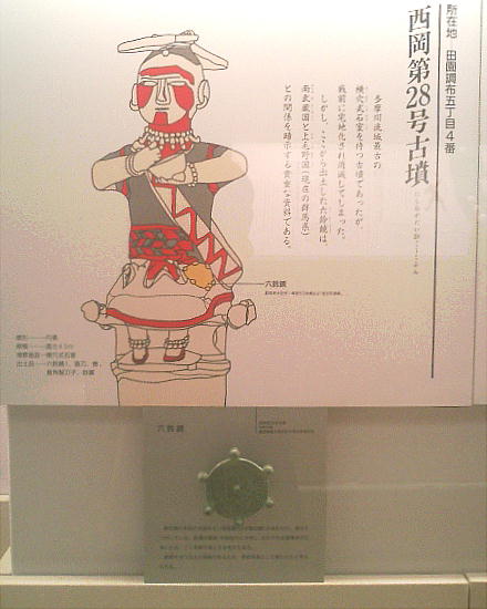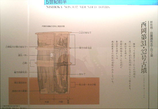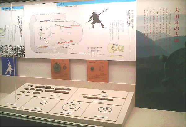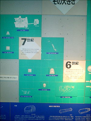 古墳館の壁には、古墳の作り方や、世界の墓(ピラミッドや秦の始皇帝陵など)と多摩川周辺古墳群との大きさ比較などのパネルや、