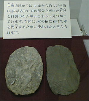 末野遺跡から出土した大型の石斧は、刃部分を研磨しており、局部磨製石斧と呼ばれています。この石器は、今から3万年