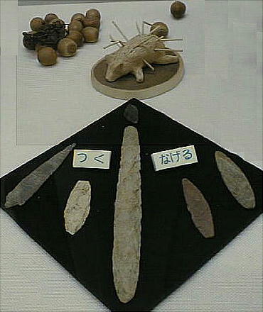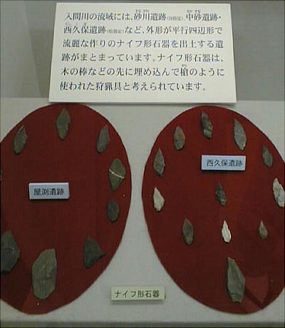 1万数千年前のあいだ多く作られていました。ここで展示している石器は、ナイフ形石器の最盛期のもので、形状が平行四