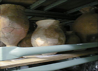 1階の奥と2階が収納庫になっている。キチンと並んだ保管棚の中は土器などの出土品で満杯だ。これからの整理を待って