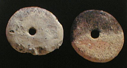 下左は、土器製の紡錘車(ぼうすいしゃ)。先述の四ッ池遺跡から出土。真ん中の穴に棒を通し、回転させながら糸によ