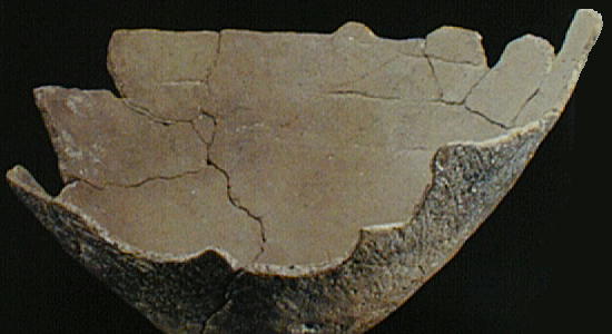 上右、同遺跡出土「深鉢」。口が大きくそこが小さい、典型的な縄文晩期の土器。粘土中の小石や雲母片から、生駒西山