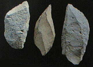 上左、鈴の宮遺跡「ナイフ形石器」。サヌカイト製の薄片を加工して刃を作っている。鈴の宮遺跡は石津川流域の沖積段