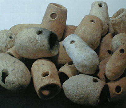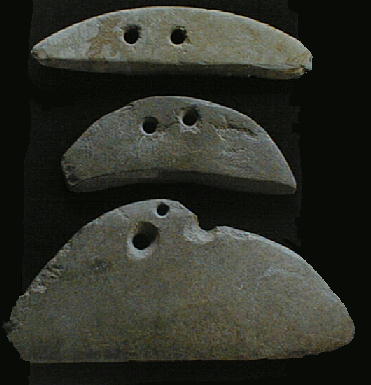 下二つの写真も四ッ池遺跡から。左は石包丁。穴に指を差し込み刃で稲穂をこそぎとった。石包丁は朝鮮半島経由で我が