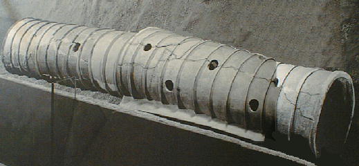 以下は埴輪円筒棺で、長さ1.2mを越える大型の円筒埴輪を2個組み合わせてある。土師遺跡から出土したもので、通常こ