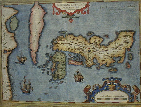 「堺市図」下右は、1595年版オルテリウスの世界地図帳に記載された「日本島図」。ヨーロッパで印刷された日本単独図