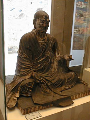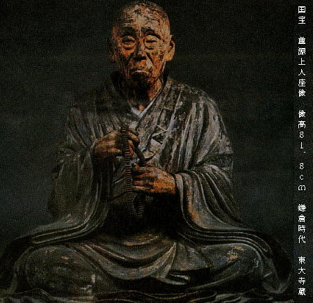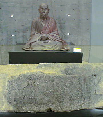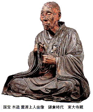 「非人」まで含めて、あらゆる人々が工事に協力していたことが記(しる)されている。 重源像のレプリカの前にある