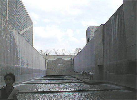中庭は両側が滝のカーーテンで仕切られていて、端からは澄み切った青空がポッカリと切り取ったように見える。