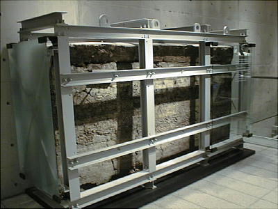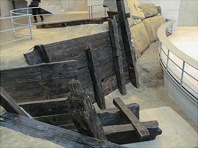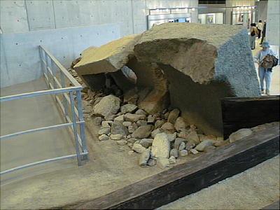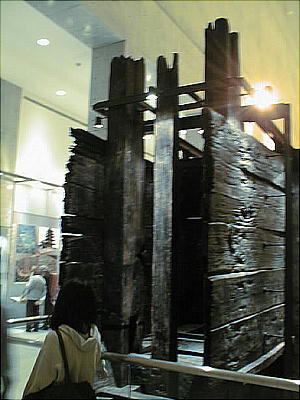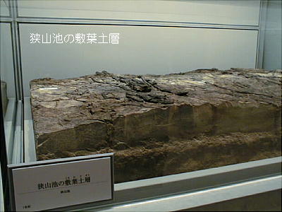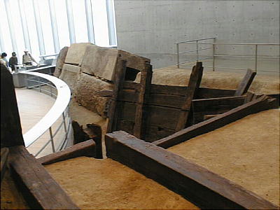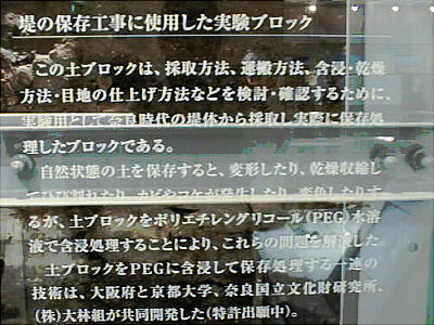 飛鳥時代の敷葉工法(しきはこうほう)を用いて築かれた狭山池の堤(高さ約15m、幅約60mの堤の断面)を移築展示。