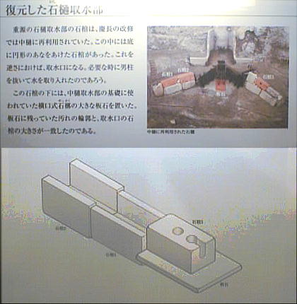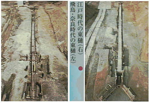 年輪年代測定の結果、AD616年と判定された伐採年を持つ飛鳥時代の東樋(ひがしひ)と、江戸時代の東樋を長さ約60mにわ