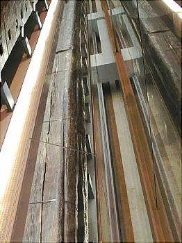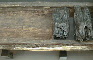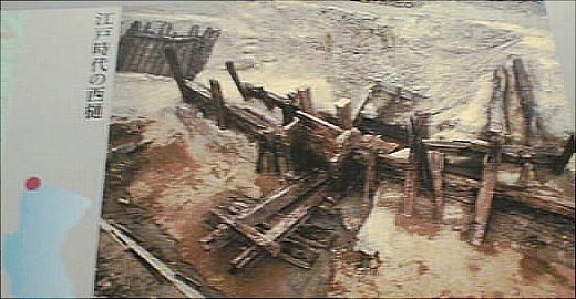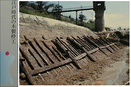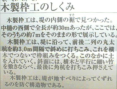 慶長の改修(17世紀初め)でつくられた中樋と木製枠工(堤の基礎を補強する木組)を移築展示。