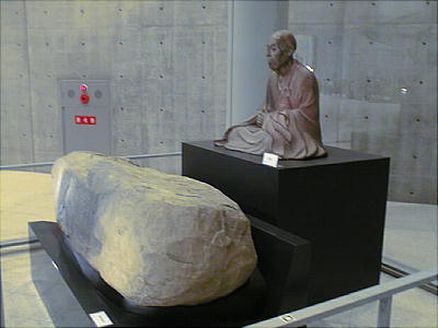 狭山池博物館の重源座像(上左:レプリカ)と、三重県・新大仏寺の重源座像(上右:重要文化財)