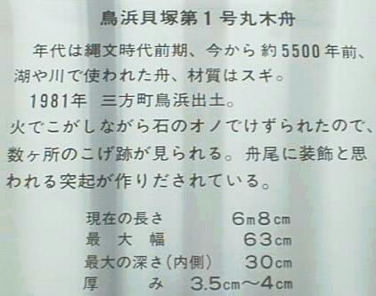 目玉出土品の一つ「丸木舟」は、三方町の「縄文博物館」の開館記念にそちらへ貸し出し中であった。でもこの後そこへ行