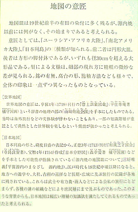 日本地図、欧文文字などの斬新な意匠が試みられている。一方で、中国や日本の絵画の画題なども取り入れ、様々な創意工