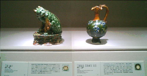 では、あわせて中国と日本の三彩陶(さんさいとう)や緑釉陶(りょくゆうとう)を展示し、それらを比較検討することに