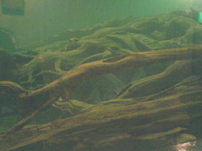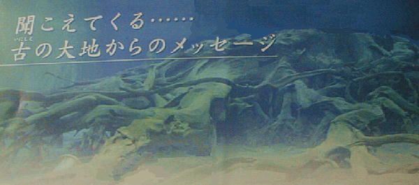 ることができる。正面の大きな水槽の中には四方に根を張った巨大な樹根が三体鎮座している。古代からこ
