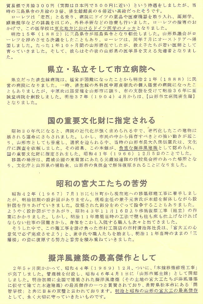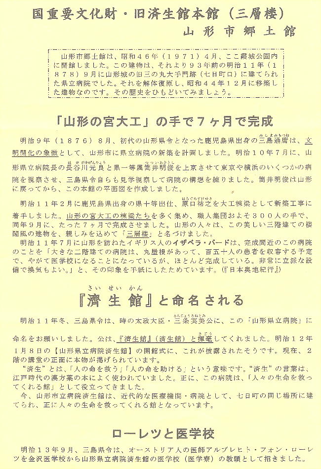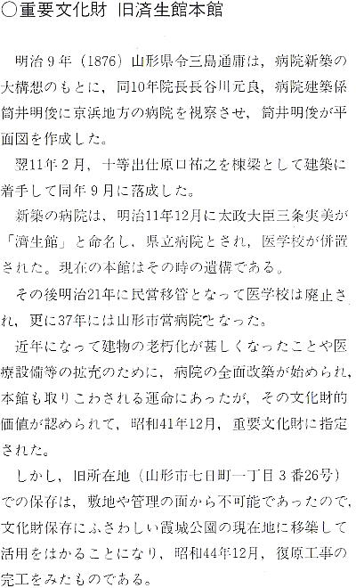 明治11年に竣工され、県立病院「済生館」として利用された重要文化財の建物を移築復元し、昭和46年に山形市郷土館