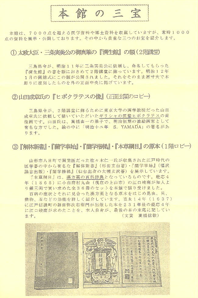 として開館。1・2階を公開し、常設展示を行っている。展示物は旧済生館の医療・医学教育に関連する資料、漢方や西洋