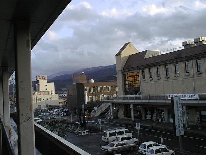 茅野駅から望む八ヶ岳と、駅のホームにあった「黒曜石」の原石。地元の人はこれが祖先の「道具」の元と理解しているだろうか?