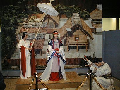 このホームページの中の、卑弥呼の生活と宮殿、というページの卑弥呼の写真は、実はこの博物館に展示してある卑弥呼の人形の写真である。私の友人など、一体どこの女にあんな格好をさせたのだと言っていたが、実は人形である。誤解に弁明すると同時に、弥生文化博物館には感謝の意を表明したい。左側の銅鐸のレプリカもここに置いてある。