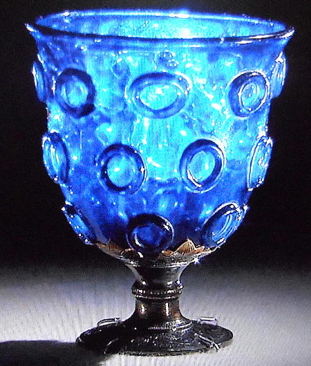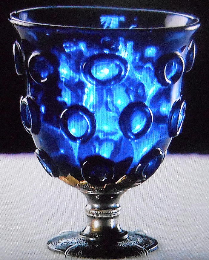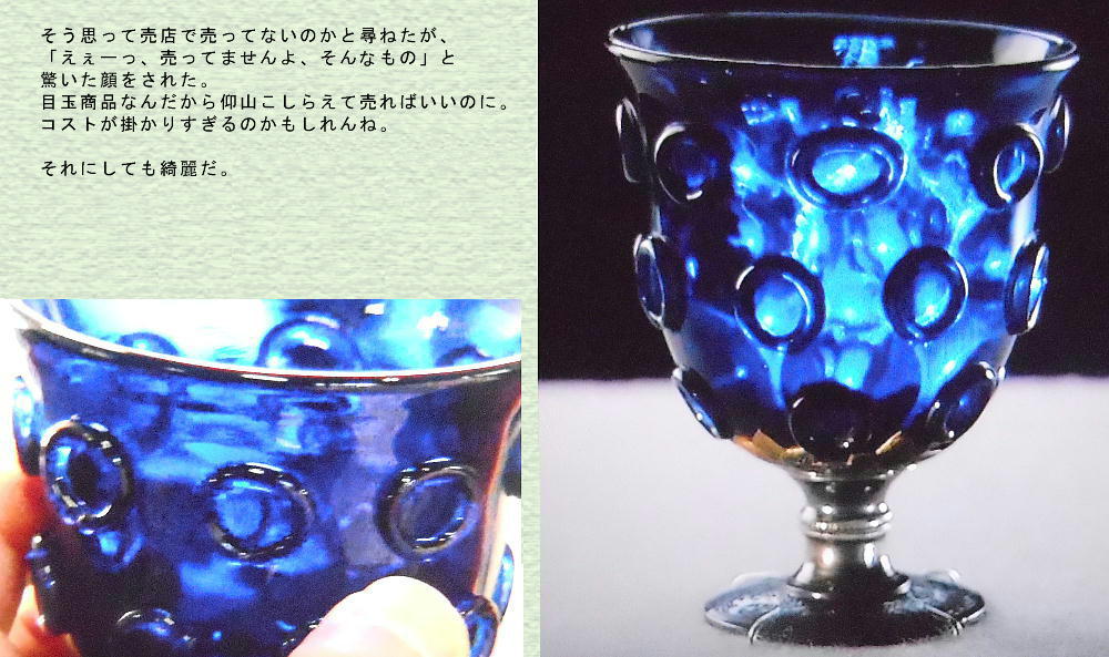 紺色のカップ形ガラス坏で、銀製鍍金の台脚を接着する。アルカリ石灰ガラス製で、コバルトによる発色が鮮やかなガラス坏。表面
