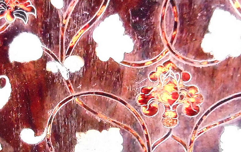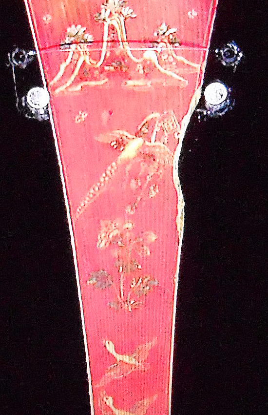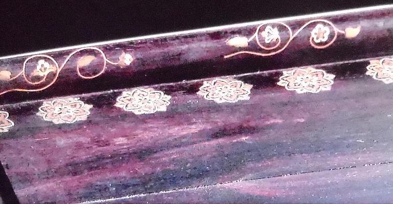 聖武天皇ゆかりの四弦の琵琶。裏一面に螺鈿(らでん)・玳瑁が施されている。材質は、槽より鹿頚及び転手は紫檀、腹板はヤチダモ