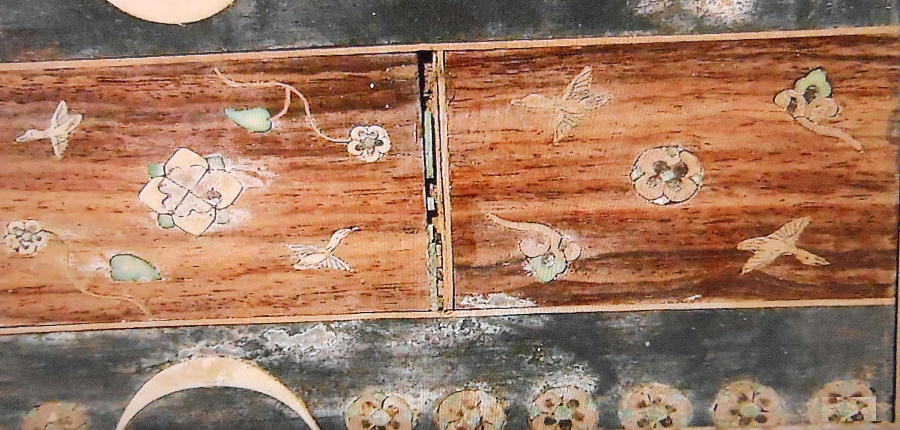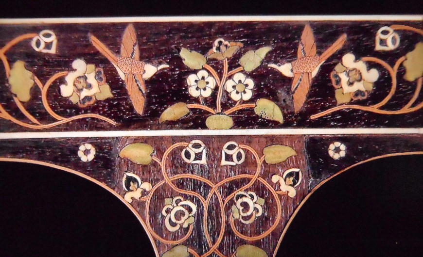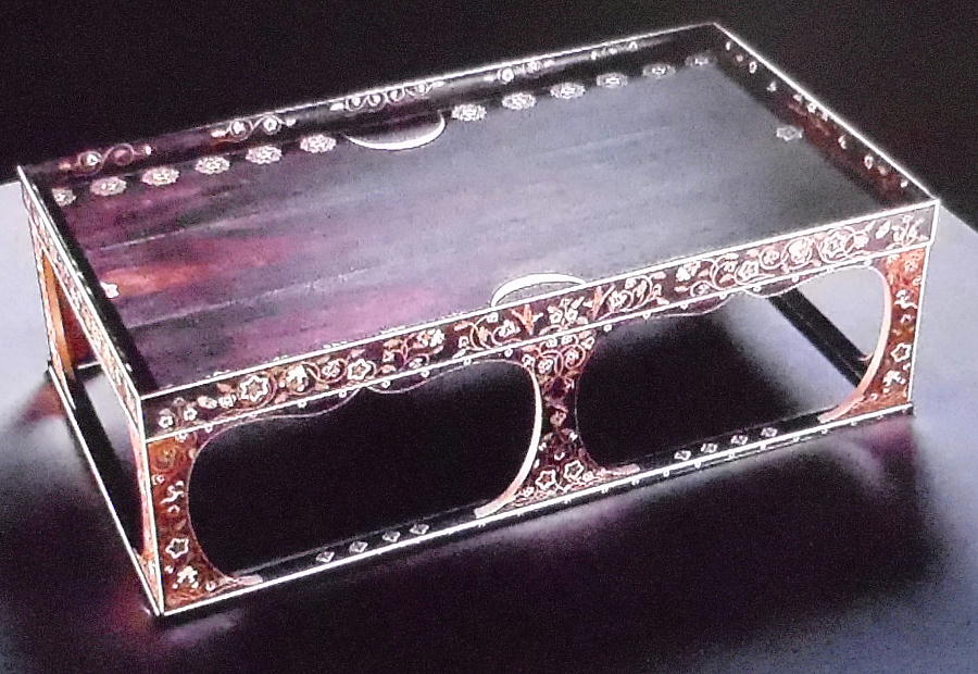 木画の技法で装飾した愛らしい花鳥が描かれたすごろく盤。ひきだしを内蔵する天板部分を床脚で支える。聖武天皇が愛用したと伝わる。