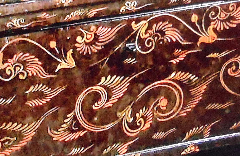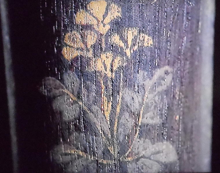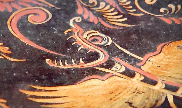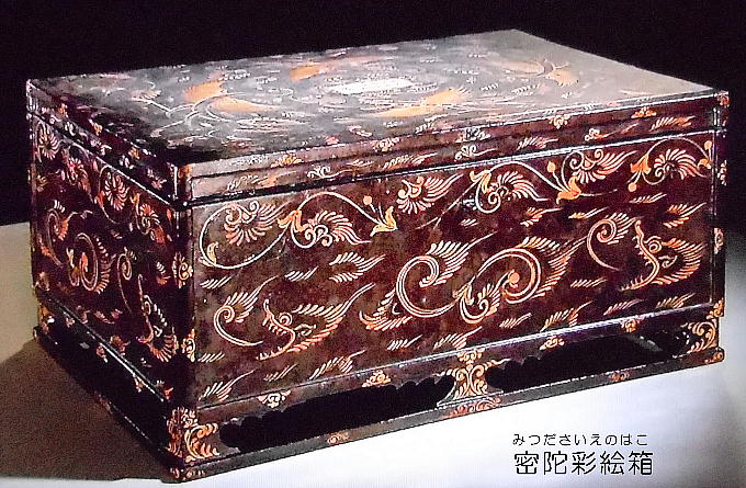 床脚にも蕨手状の草文が配される。漆地に膠絵(にかわえ)を描いた上に、油をひいたもの。この密陀彩絵箱は、丁香(ちょうこう)など