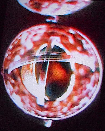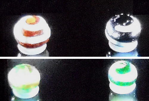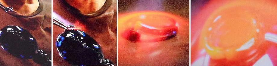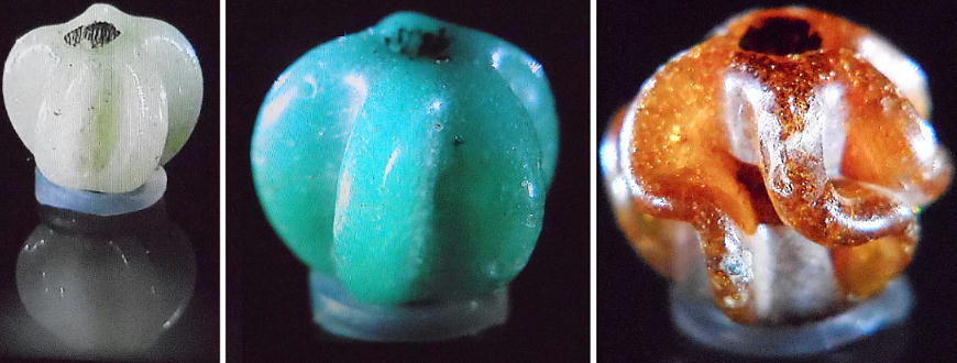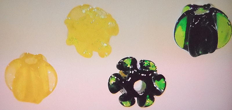 特殊な形のガラス玉。クチナシ玉は、金属の棒に溶融したガラスを巻き付けて丸くした後、側面から棒を押しつけて