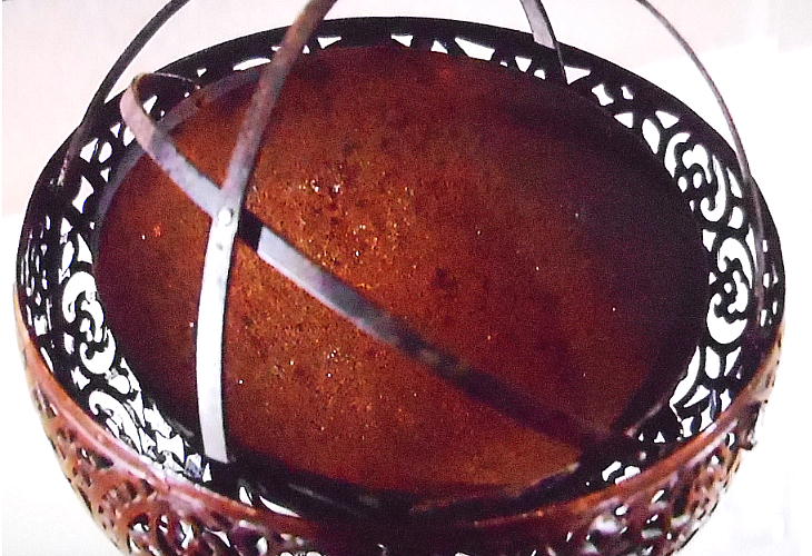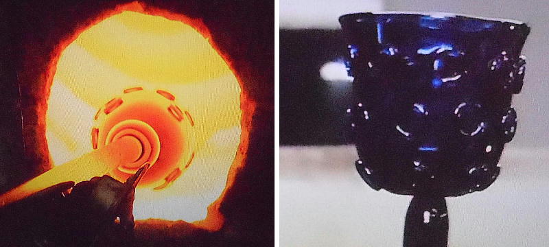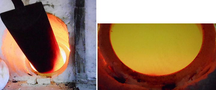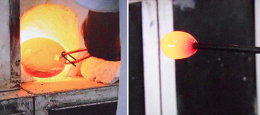輪飾りとグラスを溶かし込むため、全体をもう一回火に溶かす。熱いうちに整形し、冷ましてバリをとる。