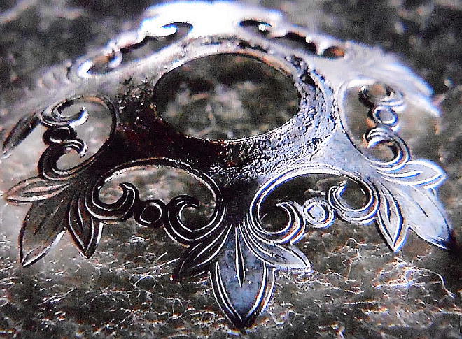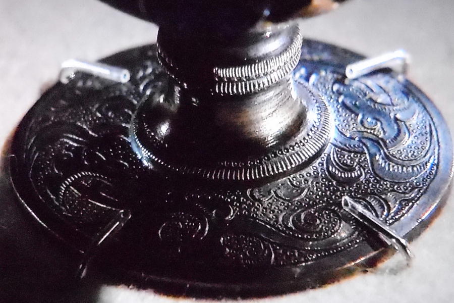 には、同じ素材のガラスで輪が貼り巡らされている。銀製鍍金の台脚は先端が霊獣の頭部に変化した唐草文が毛彫(けぼり)されて