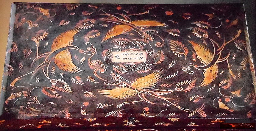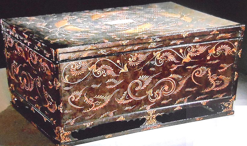 をいれた箱で、空想上の動物である鳳凰とパルメット唐草(忍冬唐草)が躍動的に描かれている。8世紀。