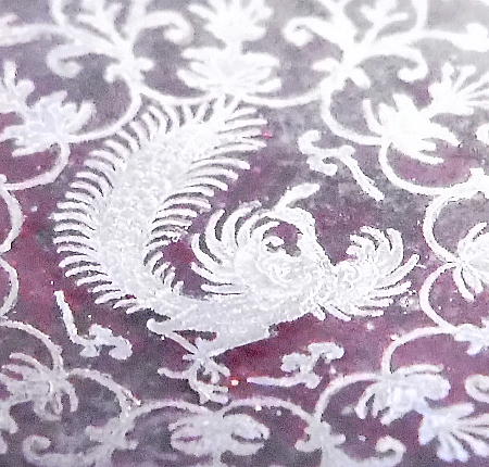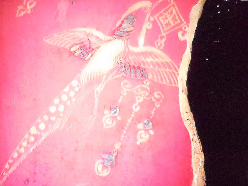 目が回りそうな図案である。周囲で渦を巻く唐草模様が、翼を広げた鳥たちの躍動感、スピード感を、一層際立たせている。