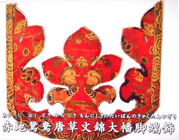 聖武天皇が纏った袈裟をはじめ、大仏開眼会(かいげんえ)で用いられた幡や伎楽衣装、仏堂を飾った天蓋(てんがい)机の褥(じょ