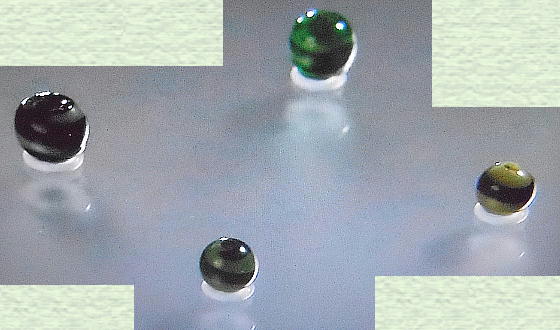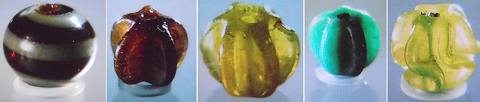 縞模様のガラス玉。縞模様はガラス玉の上に異なった色のガラスを巻き付けて表現する。色合いは多様である。